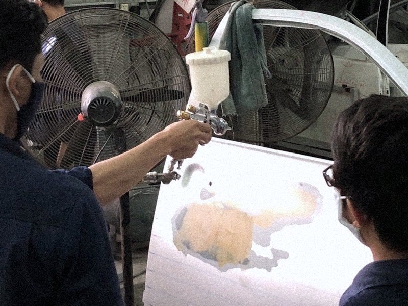 板金塗装とは板金・塗装の2つの工程からなる修理方法で、引っ張ったり叩いたりすることで凹みをなくし、塗装を施すことでキレイに修復する作業です。